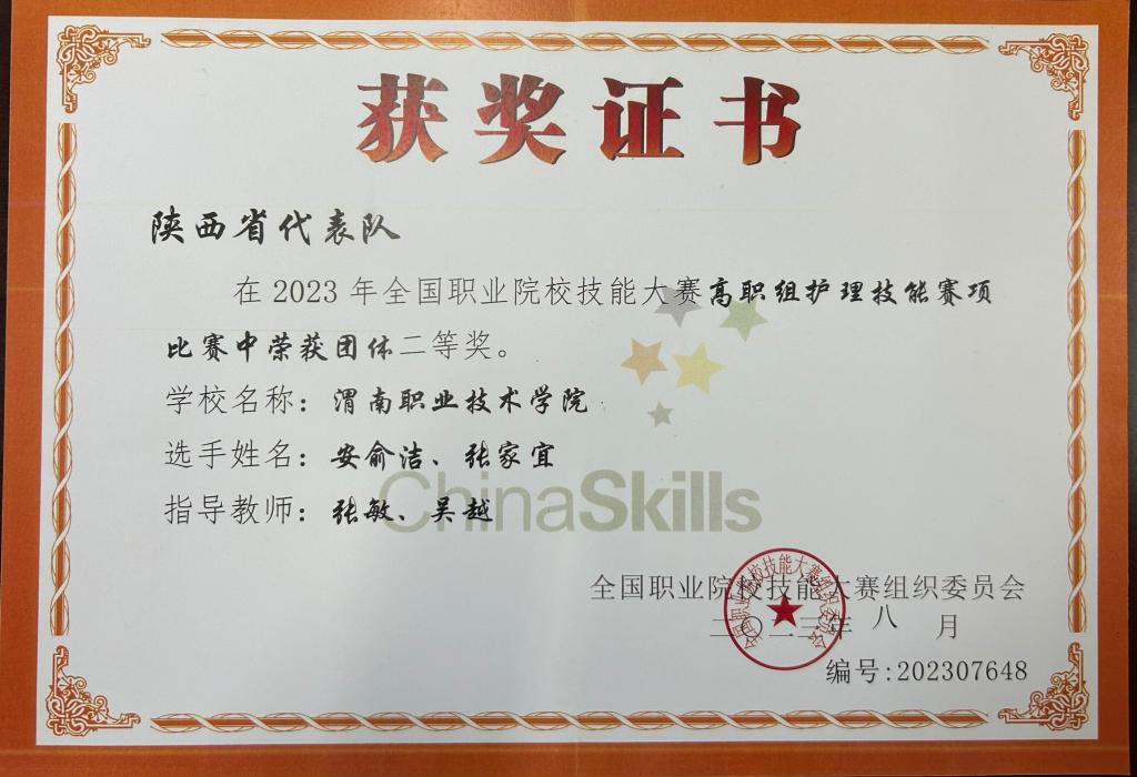 (2)学生技能大赛:获2023年全国高职院校护理技能赛项(团体)二等奖1项。护理高水平专业群群内专业获陕西省职业院校技能大赛奖项10项,其中一等奖3项、二等奖5项、三等奖2项。