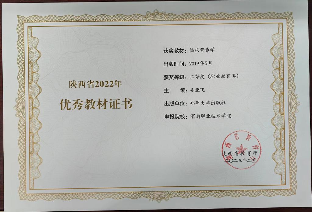 吴亚飞教授主编《临床营养学》荣获省级优秀教材二等奖。《临床营养学》《基础护理技术》《中医护理》《护理礼仪与人际沟通》获批省级规划教材。