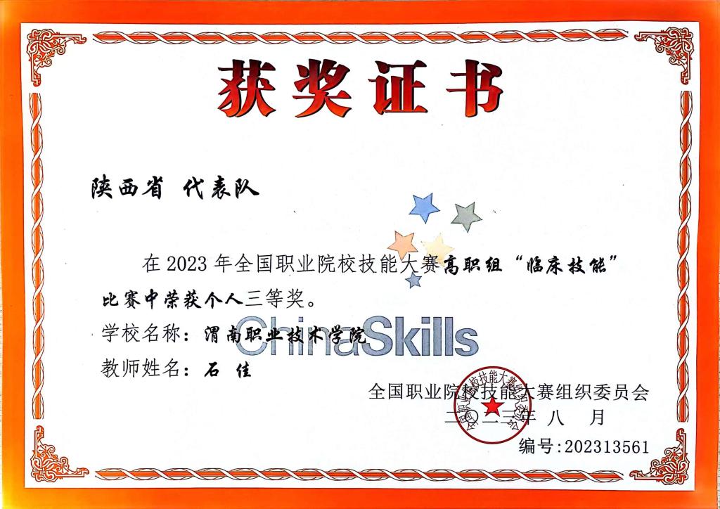 (3)教师技能大赛:获2023年全国高职院校临床技能赛项三等奖1项。省级临床技能赛项获奖4项,其中一等奖2项、二等奖1项、三等奖1项。