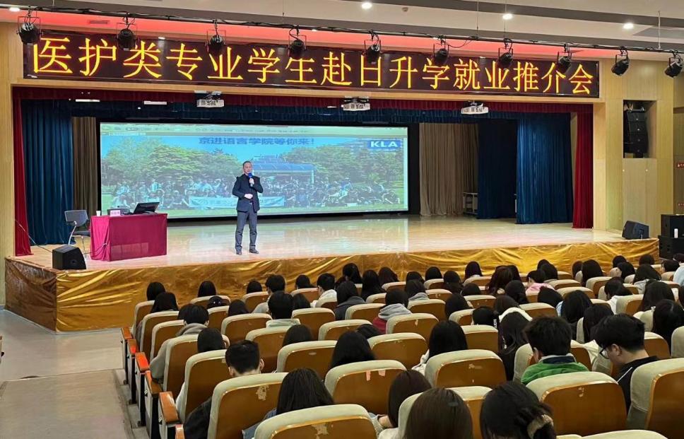 为拓宽我院学子升学就业渠道,提升职业教育国际化发展水平,澳门网投唯一官网、对外交流与合作处于3月20日下午在图书馆一楼报告厅组织召开了医护类专业学生赴日升学就业推介会。对外交流与合作处负责人尹育华、京进语言学院院长陈俊林、亚洲教育医疗振兴会会长李俊峰及500余名学生参会。会议由澳门网投唯一官网党总支副书记周梦花主持。