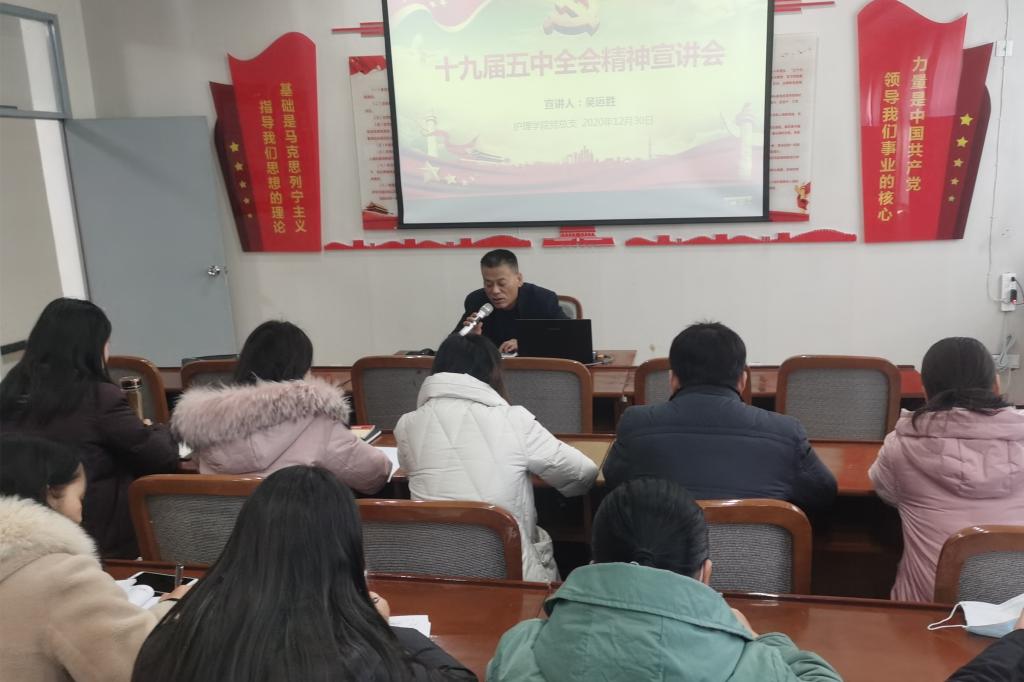 12月30日下午,澳门网投唯一官网党总支组织全体党员干部、20余名入党积极分子及教师代表在医训楼南楼第二会议室召开了学习贯彻党的十九届五中全会精神宣讲会,我院党总支书记吴运胜担任主讲,党总支副书记李晓乾主持了宣讲会。