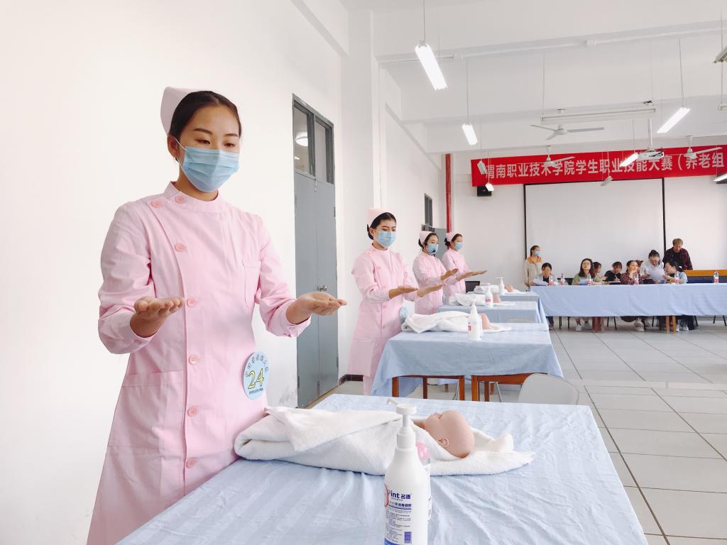 为了夯实学生的理论基础,强化操作技能,根据学校工作安排,澳门网投唯一官网于9月23日下午在医训楼北楼312实训室举行了2020年学生技能大赛(养老组)的比拼。我院副院长任秋爱等出席了比赛,祁晓民等5名专业老师担任大赛评委。进入决赛的24名选手在血压测量、轮椅运送老年人和新生儿抚触三项常用护理技术展开激烈的角逐。