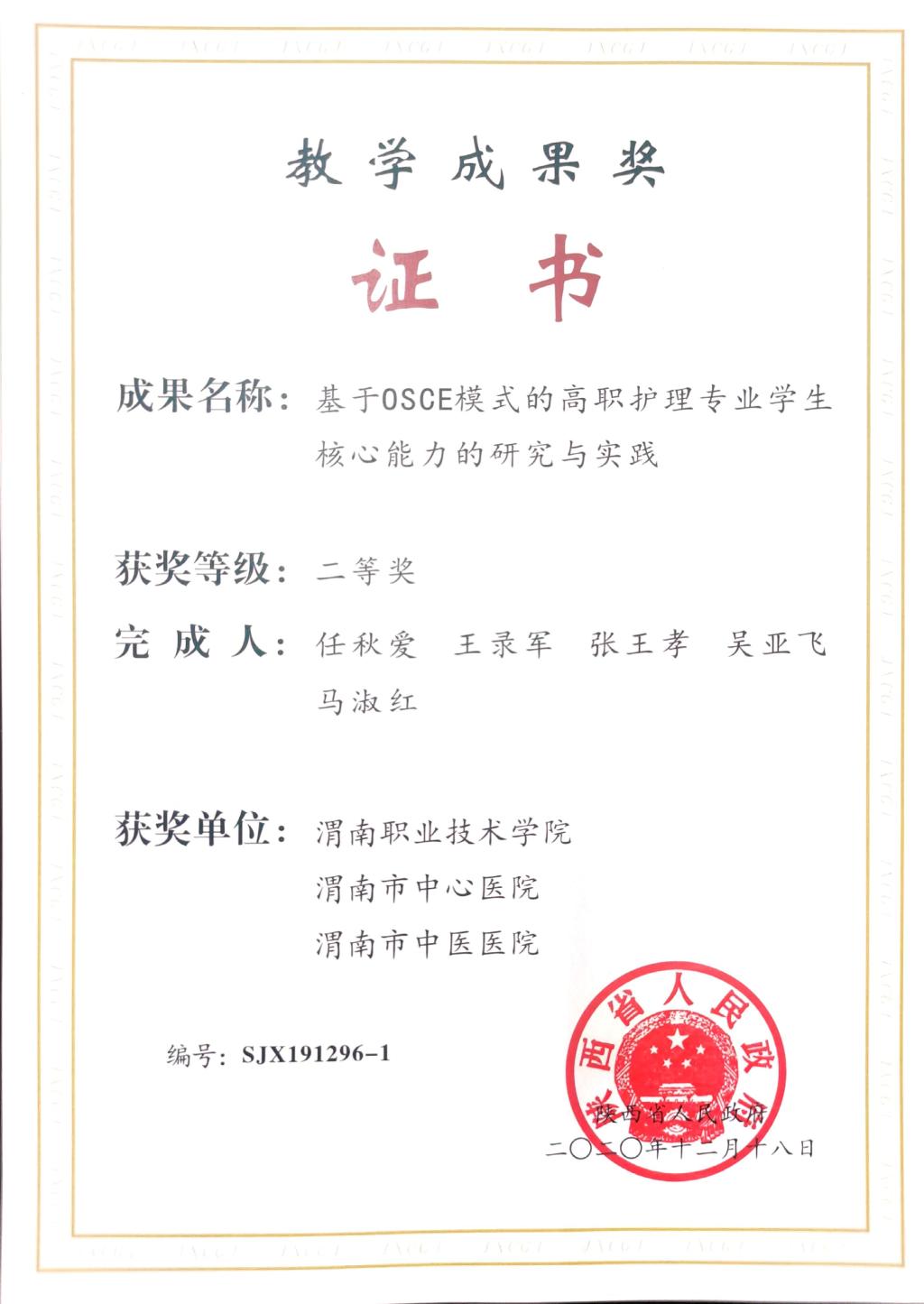 近日,陕西省人民政府办公厅下发了《关于表彰2019年高等教育教学成果奖获奖项目的通报》(陕政办函〔2020〕137号),澳门网投澳门网投唯一官网“基于OSCE模式的高职护理专业学生核心能力的研究与实践”荣获省级教学成果二等奖1项,这是澳门网投唯一官网第二次荣获该奖项。