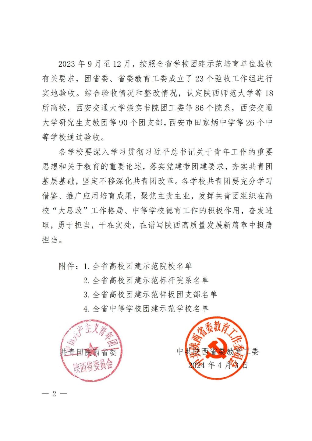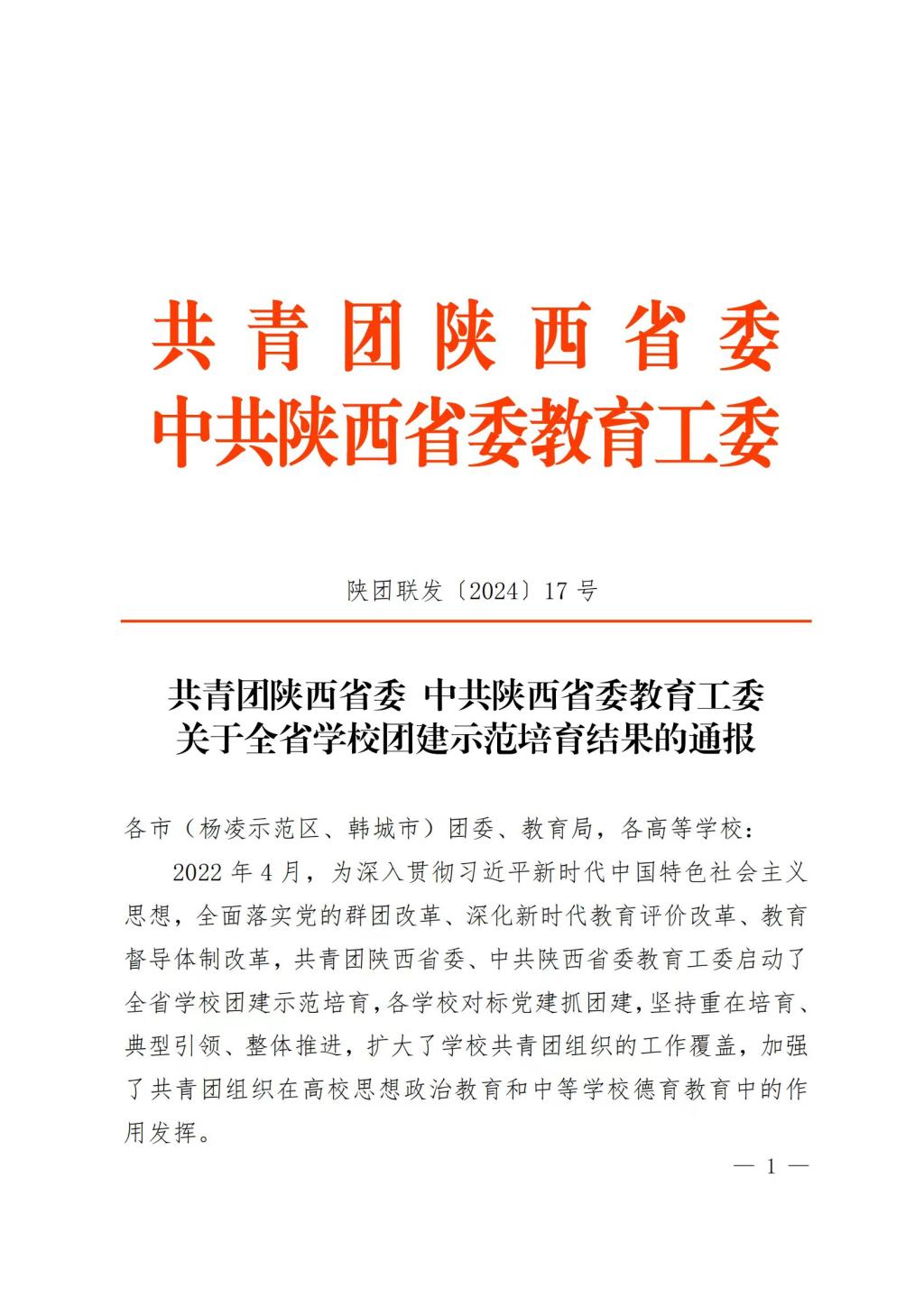 近日,共青团陕西省委、中共陕西省委教育工委联合印发了《关于全省学校团建示范单位培育结果的通报》,澳门网投唯一官网团总支被确定为“全省高校团建标杆院系”,并授予荣誉奖牌。