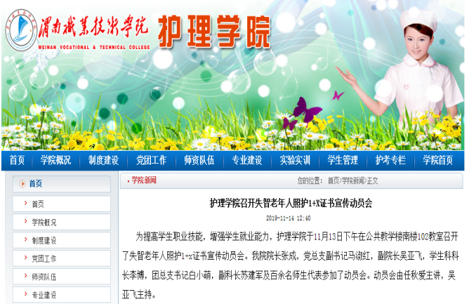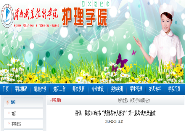 澳门网投护理专业在不断创新人才培养模式、畅通多元发展的人才培养枢纽的基础上,率先尝试1+X证书制度的试点工作,坚持育训结合、内外结合、长短结合,促进书证融通,夯实学生可持续发展基础。成功申报“失智老年人照护”和“母婴护理”证书试点,以“不用扬鞭自奋蹄”的强烈使命感和责任心,精诚团结、努力工作,在短短几个月时间里,完成一系列工作任务,取得显著实效。