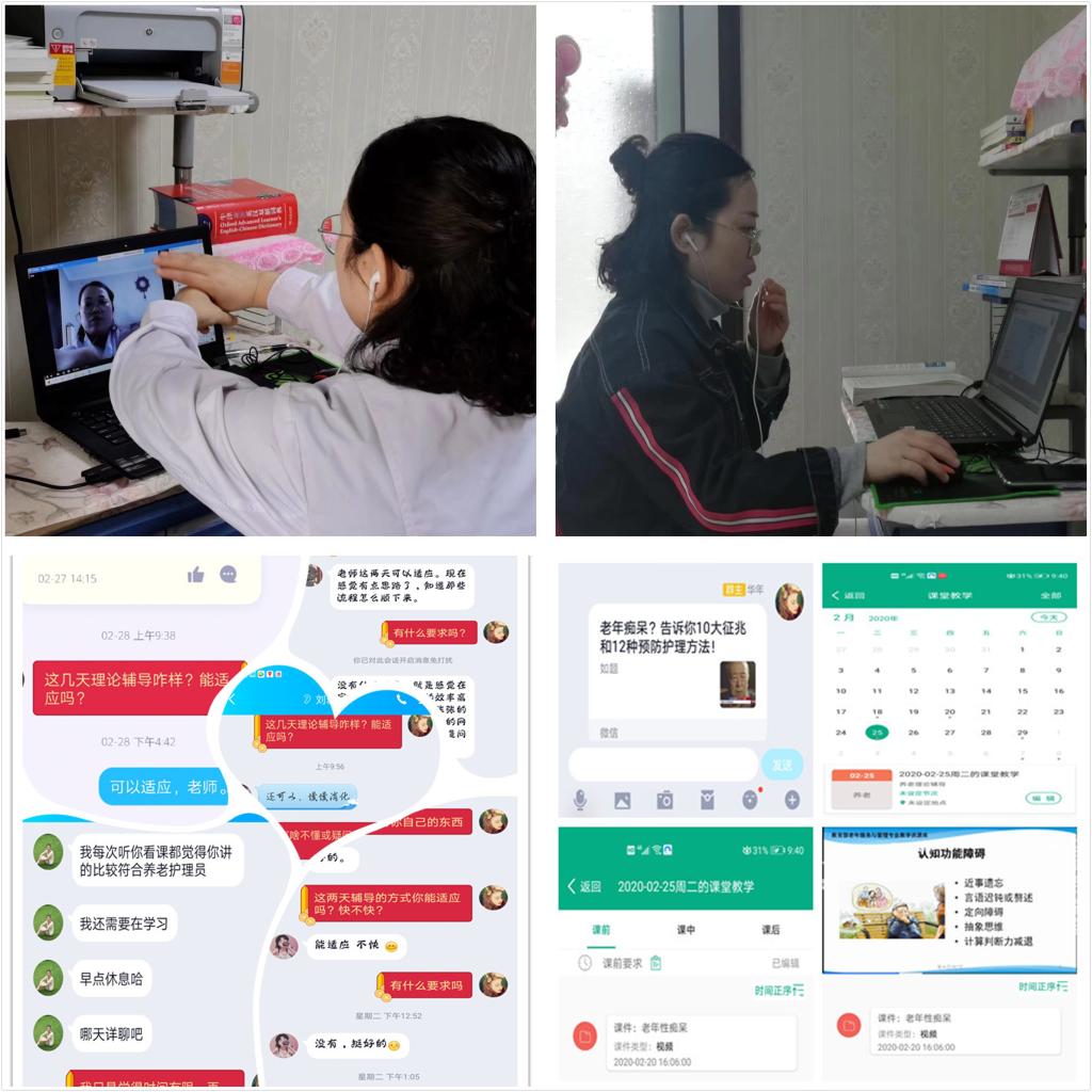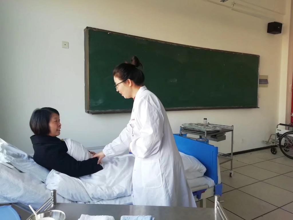 面对年初突如其来的新冠肺炎疫情,孙会娟老师表示:“春节期间突遇新冠疫情,学校被迫延迟开学,在此特殊时期澳门网投唯一官网张成院长、吴亚飞副院长、任秋爱副院长分别对疫情期间线上辅导工作进行了详细的部署和安排。张院长要求疫情期间“停课不停教,停课不停训”,强调稳定好学生情绪的同时,周密计划、实施疫情期间的训练安排。直至2020年4月疫情后返校,养老组完成了2018年、2019年国赛理论、实操案例库的辅导,以及大赛礼仪培训。疫情期间,辅导教师团队利用QQ群、职教云、微信等平台对学生进行了理论、实操辅导和线上答疑。理论主要通过职教云和QQ直播的形式线上集中辅导、线下整理消化,学生将作业完成后拍成图片或以WORD文档形式反馈到QQ群后由老师批阅修改。实操方面各辅导教师将生活照护、基础照护和康复训练模块的示范过程录制成视频分享到QQ群,学生在家利用实物练习,再将练习情况拍成反示教视频发到群里,老师逐一点评指正。此外,我们把大赛礼仪培训分为静态、动态礼仪两部分。静态礼仪包括眼神、面部表情、手臂姿势(指示物品位置、邀请进出门、请就坐)、站姿等身体语言;动态礼仪包括走姿、转身、搀扶、蹲姿、指引、进出门、核对用物、上下楼梯等。学生对照镜子练习眼神、表情以及站、坐、蹲等仪容仪态,经过在家反复苦练将每个礼仪动作潜移默化融于比赛项目的练习中,力求使学生在赛场上的所有表现高标准地契合礼仪要求。”